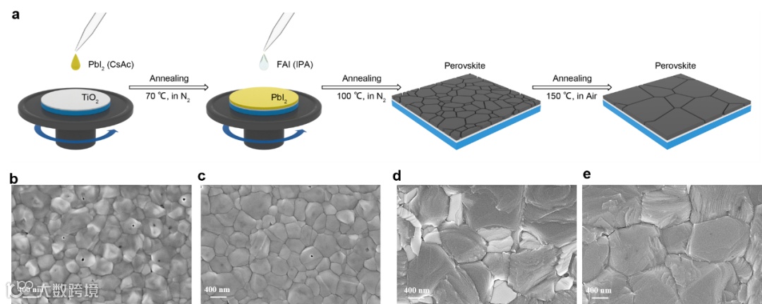 图 1. a) 钙钛矿薄膜的两步顺序制造方法示意图。在旋涂 FAI 溶液后的第一个退火步骤后,钙钛矿薄膜 b) 未使用 和 c) 使用 CsAc 处理后的俯视 SEM 图像。钙钛矿薄膜 d) 未使用和 e) 使用 CsAc 处理的在空气中退火后的俯视 SEM 图像。