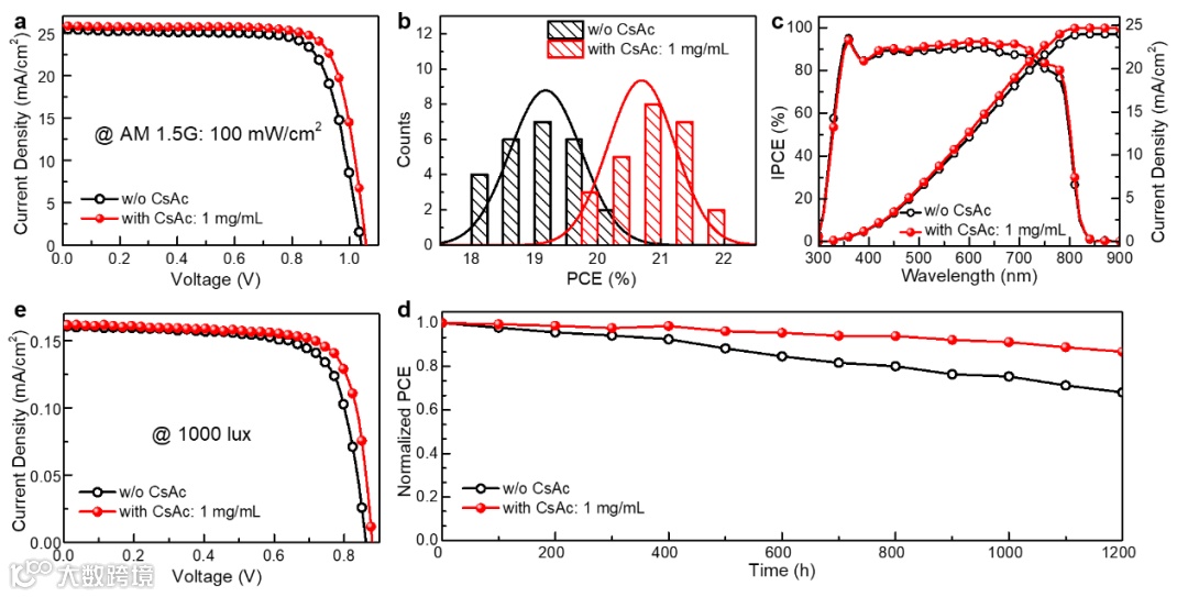 图 3. a) 在强度为 100 mW/cm2 的 AM1.5G 照射下测量的最佳 PSCs 器件的 J-V 曲线;b) PCE 的效率分布直方图和 c) IPCE 光谱。d) 在未封装的情况下,器件效率衰减对比。e) 在 1000 lux 下测量的器件室内 J-V 曲线。