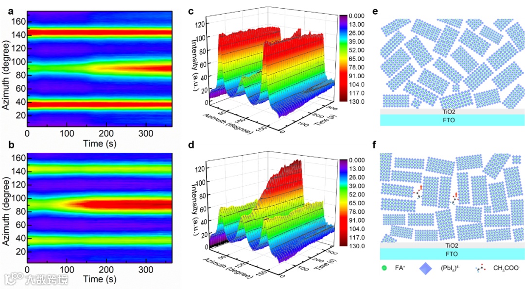 图 2. a) 未使用和 b) 使用 CsAc 处理在 q = 10 nm-1方位角积分散射强度的 2D 图,以及相应的 3D 绘图:c) 未使用 和 d) 使用CsAc 处理。e) 未使用 和 f) 使用CsAc 处理的2D 晶体取向示意图。