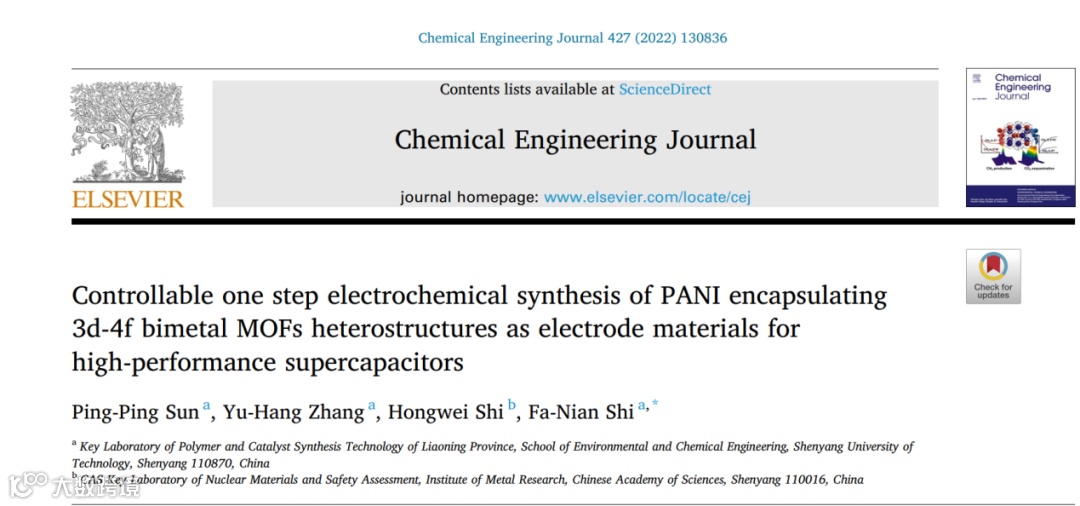 近日,沈阳工业大学的史发年教授与沈阳金属所的史洪威研究员合作,在国际知名期刊Chemical Engineering Journal上发表题为“Controllable one step electrochemical synthesis of PANI encapsulating 3d-4f bimetal MOFs heterostructures as electrode materials for high-performance supercapacitors”的文章。