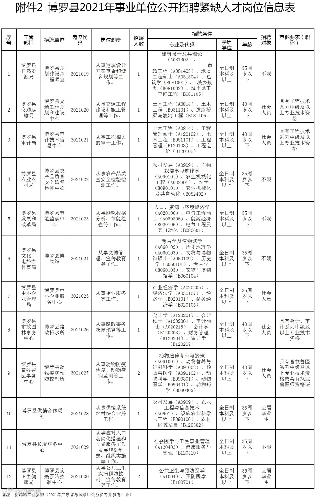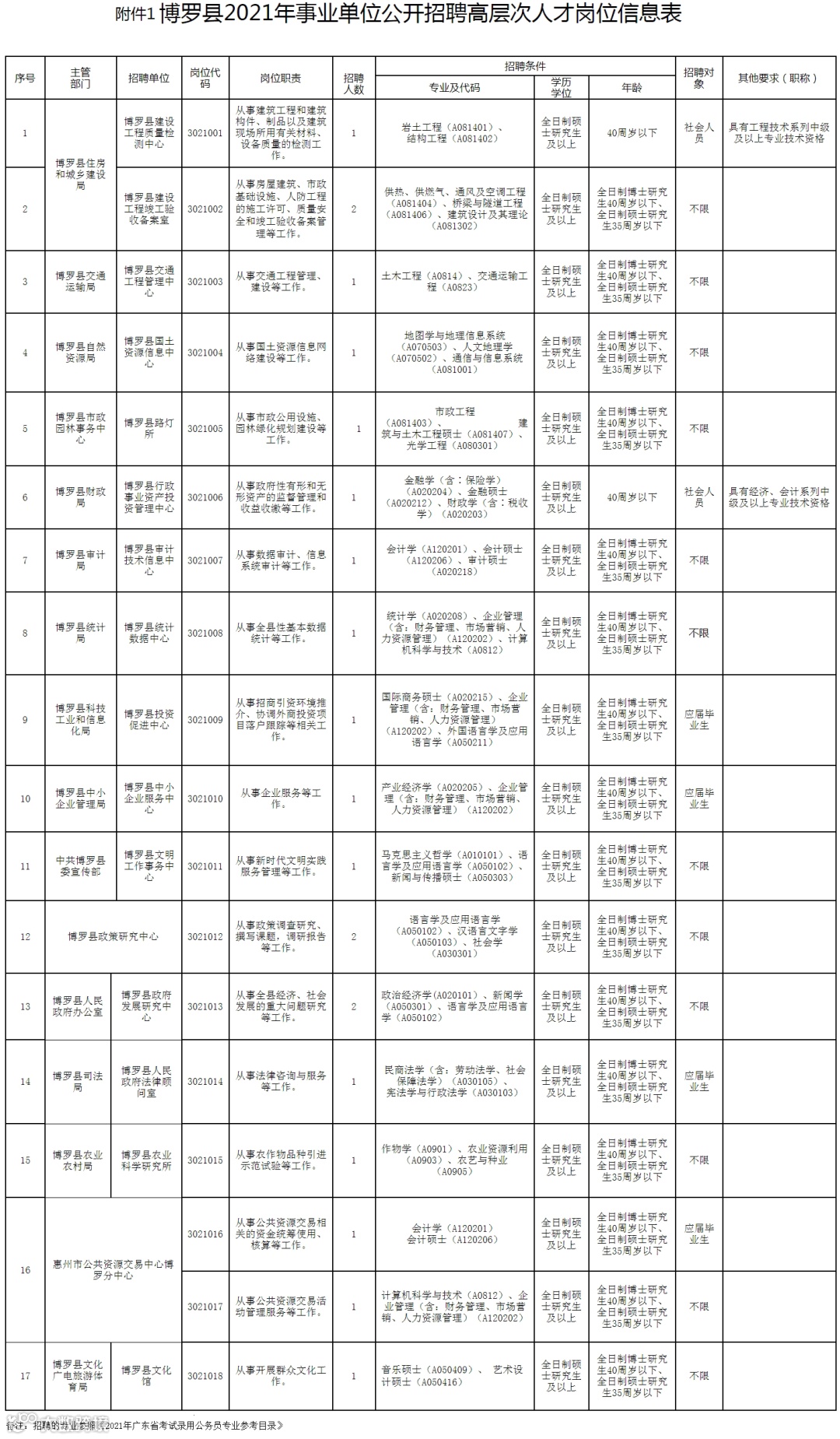 招聘人数共35名,具体岗位、人数、专业等要求详见《博罗县2021年事业单位公开招聘高层次人才岗位信息表》(附件1)和《博罗县2021年事业单位公开招聘紧缺人才岗位信息表》(附件2)。