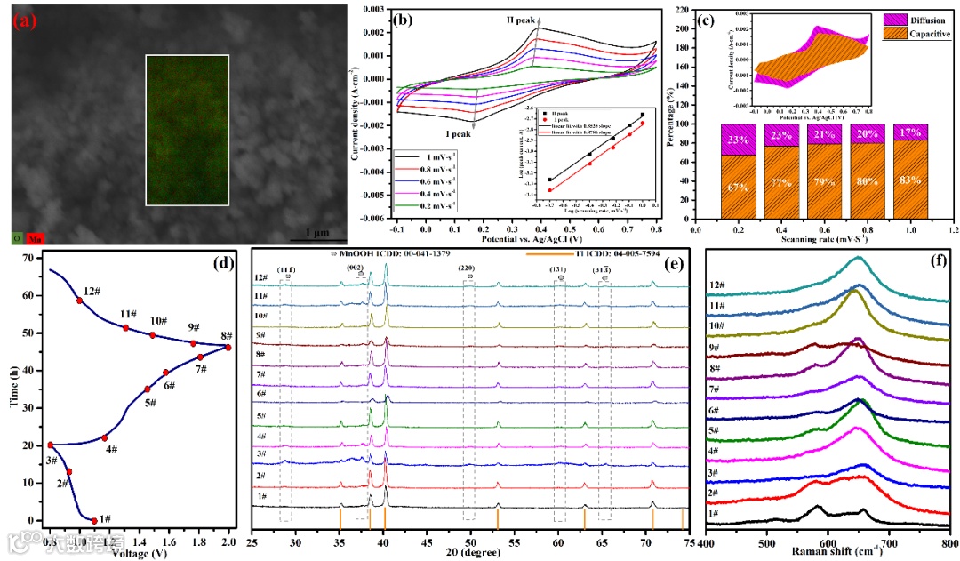 为了探究MnO2电极在OSGE中的工作机理,MnO2电极被进一步详细研究。在图4a中,纳米尺寸形貌的MnO2颗粒通过SEM和EDX被呈现,而纳米尺寸通常会增加电极非本征赝电容行为。因此不同扫描速率的循环伏安测试被用来确定MnO2电极电池和电容行为的占比,在0.2到1 mV·s-1的扫描速率下,电容行为的占比从67%增长到83%。非原位XRD和非原位Raman测试被用来证明MnO2电极电池行为的反应机制。在放电完成时,MnOOH的物相可以被XRD探测到,而在Raman测试中属于MnO2的[MnO6]的对称伸展振动无法被检测到,这证明质子参与到MnO2的电极反应中(图4d-f)。