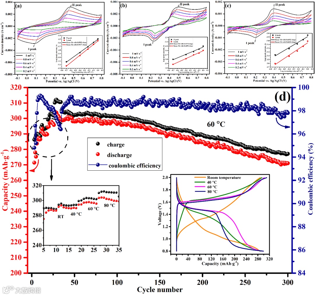要成熟商业化,电池需具有应对突发事故(过充和热失控)的能力。因此在图5中,基于OSGE的Zn-MnO2电池不仅被过充到2.0 V也在高温和5 C的充放电倍率下进行循环测试。在这之前,MnO2电极在不同温度不同扫描速率下进行CV曲线测试(图5a-c),与室温下的CV曲线相比,虽然其反应机理没有发生改变,但其氧化还原峰向电位更高处移动,这符合热力学上的解释。与此同时,随着温度的升高,CV曲线的 - 曲线的斜率也会随之降低,这表明电池行为的占比正在提升。图5d中的充放电曲线为基于OSGE的Zn-MnO2电池在室温,40,60和80ºC的充放电循环,其容量和库伦效率分别为288.5/286.5 (99.3%), 294.1/289.7 (98.5 %), 301.8/295.8 (98.0%) 和310.6/301.6 mAh·g-1 (97.1%)。高温下电池容量上的提升得益于电极与界面动力学的改善,而相应库伦效率的降低是因为同时被提高的析氢析氧反应动力学。而后该电池在60ºC(综合考虑容量和库伦效率)下继续循环直到300圈。