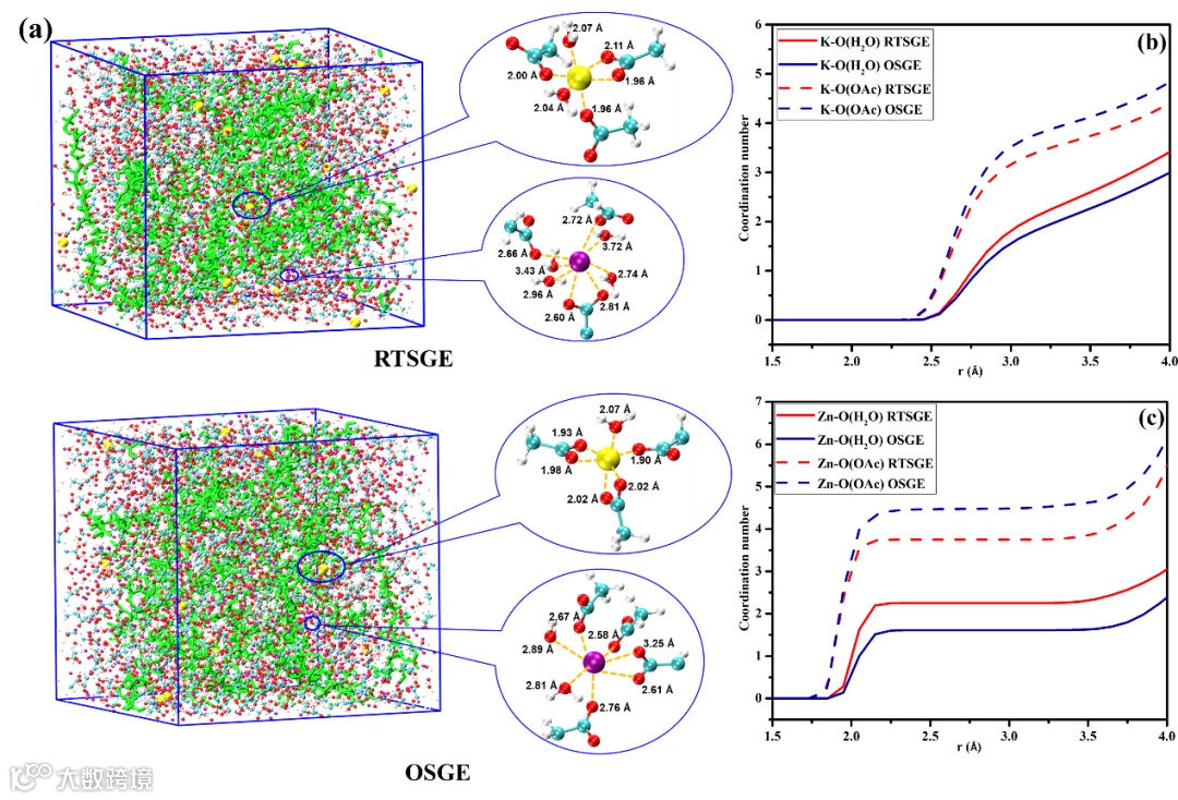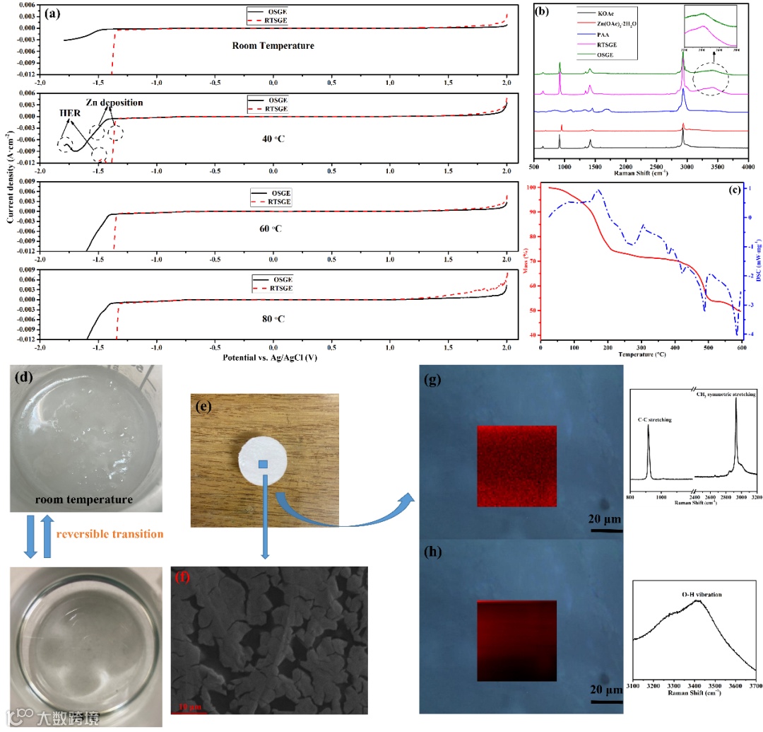 图1a 中OSGE和室温饱和凝胶电解质(1 m Zn(OAc)2+31 m KOAc-PAA, RTSGE)在不同温度下的电化学稳定窗口通过线性伏安扫描进行比较,可以看出一方面OSGE较于RTSGE有一个明显更为拓宽的窗口(3.45 V vs. 3.25 V), 另一方面RTSGE的窗口在高温下有一个明显的衰减,而OSGE的窗口在高温下可以大体保持稳定。Raman被用来从材料表征的层面来探究OSGE更为稳定的原因,发现在图1b中OSGE位于3200-3600 cm-1范围内的O-H峰明显要弱于相应的RTSGE的峰,这源自于氢键的弱化和更为拥挤的水分子。扫描电镜和拉曼成像(避免扫描电极的真空测试环境对水凝胶的干扰)被用来表征OSGE的形貌,证明其非均一的形貌(离子绝缘的析出盐晶体为弥散相,离子导电的水凝胶为连续相),但这不影响电解质整体的离子电导率,只要存在连续的离子通道。图2中的分子动力学模拟在理论上进一步证明OSGE的溶剂化结构从绝大多数电解质中的SSIP占主导演化成CIP占主导(水分子和正离子之间的配位数降低,正离子和负离子之间的距离变短),这使得电解水的活性受到抑制。
