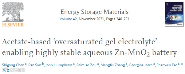 Acetate-based ‘oversaturated gel electrolyte’ enabling highly stable aqueous Zn-MnO2 battery, Energy Storage Materials, 2021, 42, 240-251.