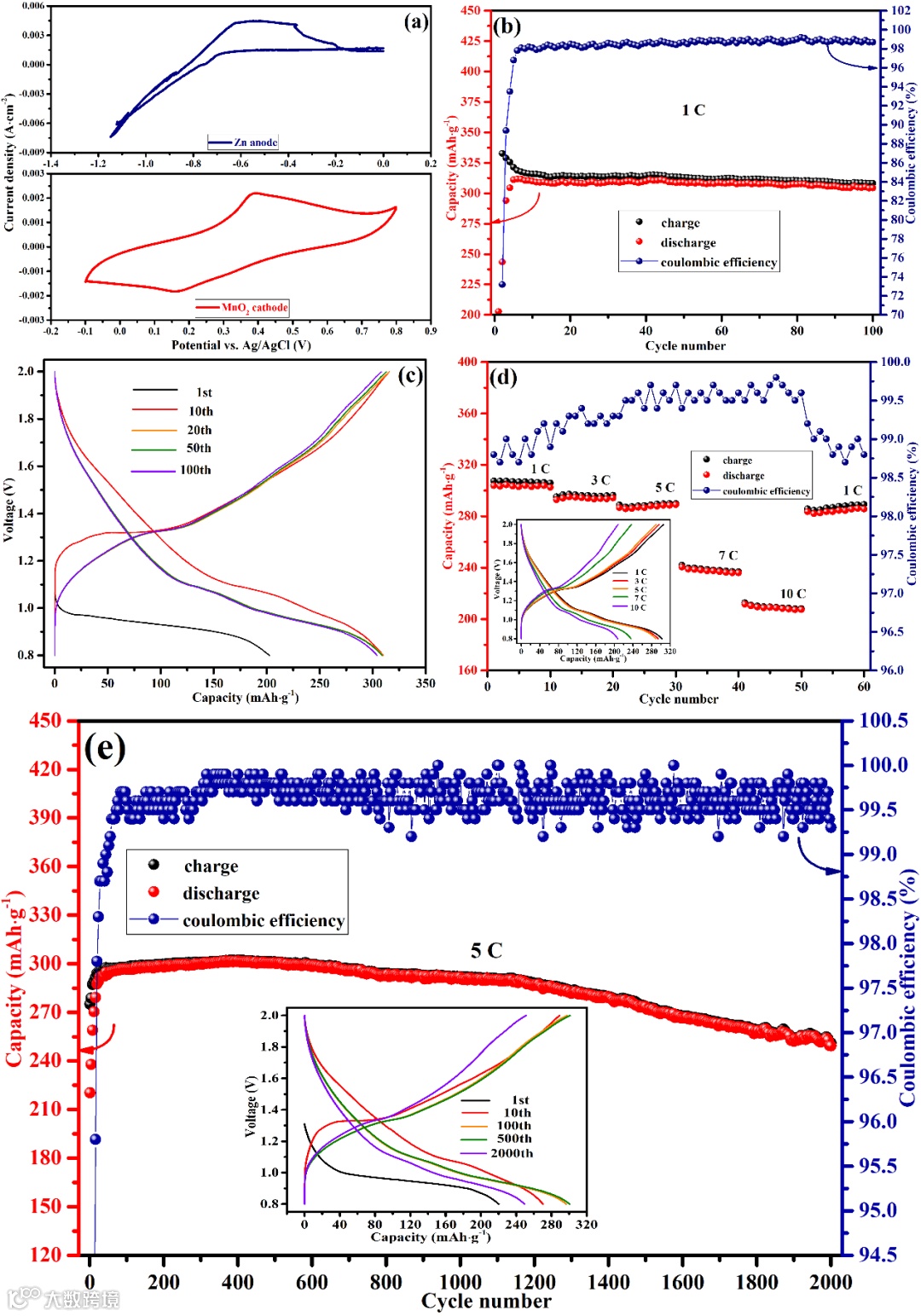 在组装成电池之前,锌和MnO2电极的CV曲线在OSGE中被分别测试来确定电极的氧化还原峰并确定电池的工作电压(图3a)。正常情况下,该Zn-MnO2电池可以被充放电到