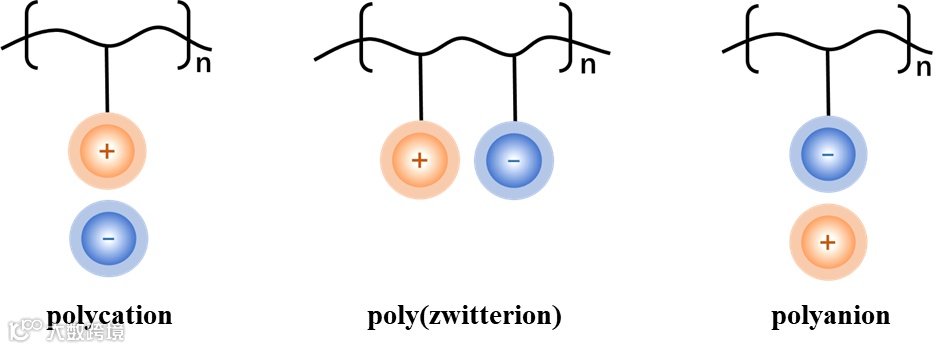 图2. 三种类型的离子液体,分别为聚阳离子、聚两性和聚阴离子离子液体