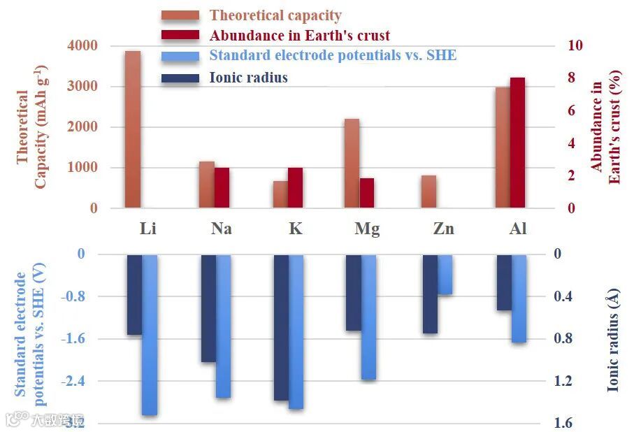 图1. Li, Na, K, Mg, Zn和Al元素的理论比容量、标准电极电位、离子半径以及地壳丰度