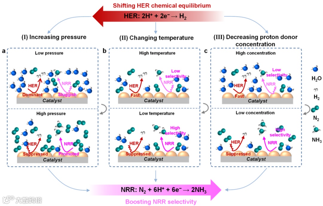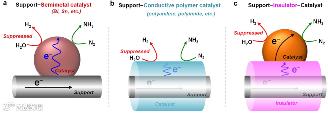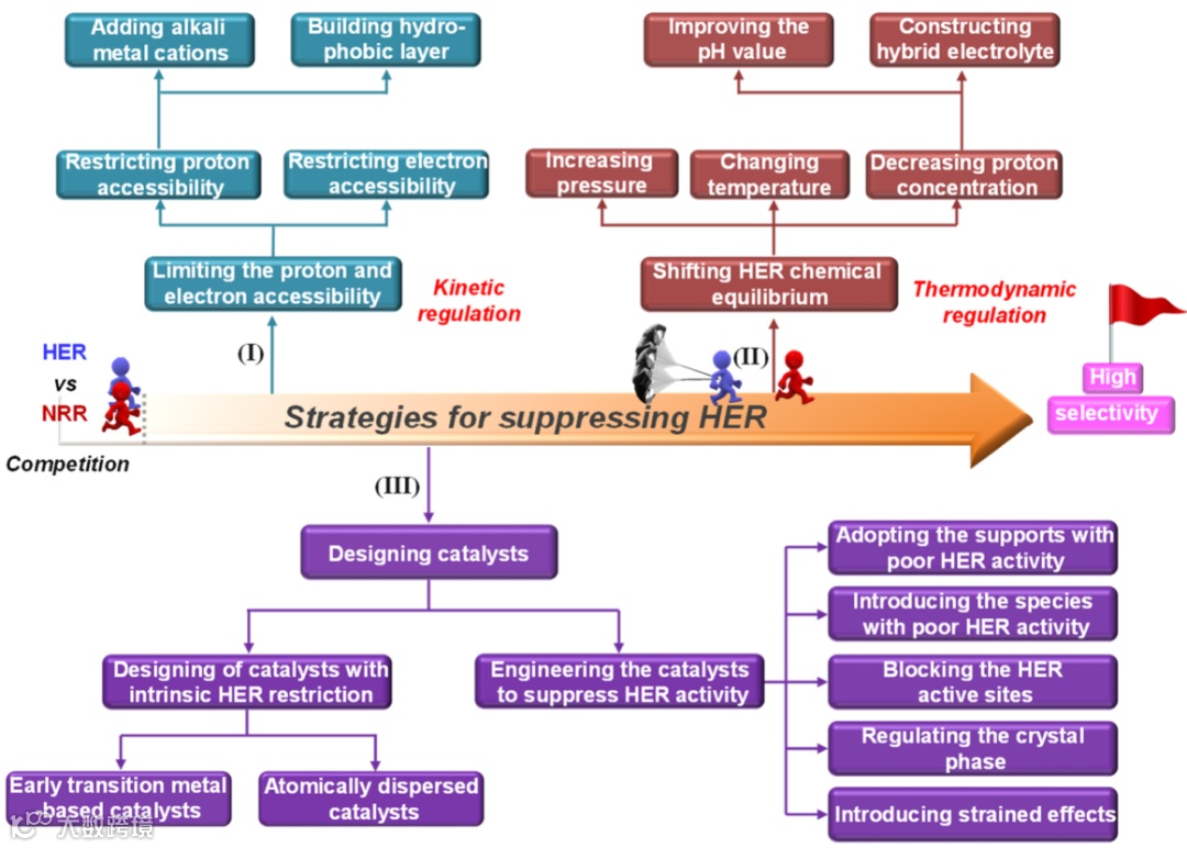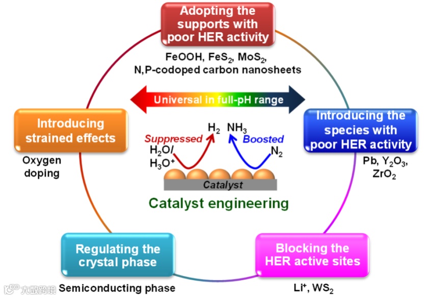 二是选择HER活性低的载体、向催化剂中添加HER活性低的物种、屏蔽HER活性位点、调控催化剂晶相以及引入应力效应等。