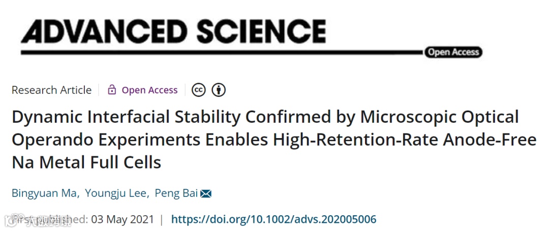 基于此,圣路易斯华盛顿大学的白鹏教授团队在国际知名期刊Advanced Science上发表题为“Dynamic Interfacial Stability Confirmed by Microscopic Optical Operando Experiments Enables High-Retention-Rate Anode-Free Na Metal Full Cells”的研究文章。
