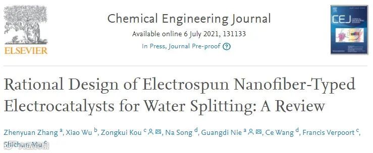 本文中,青岛大学的乜广弟副教授与武汉理工大学寇宗魁研究员合作,在国际知名期刊Chemical Engineering Journal上发表题为“Rational Design of Electrospun Nanofiber-Typed Electrocatalysts for Water Splitting: A Review”的综述文章。