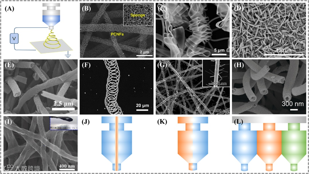 图2. (A)静电纺丝基本装置图,(B-I)不同形貌的静电纺材料,(J-L)喷丝头形式。