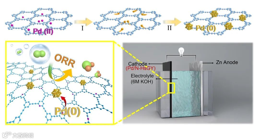 图1. 石墨炔基0价钯纳米粒子的制备及其在氧还原电催化和锌空电池中的应用示意图。
