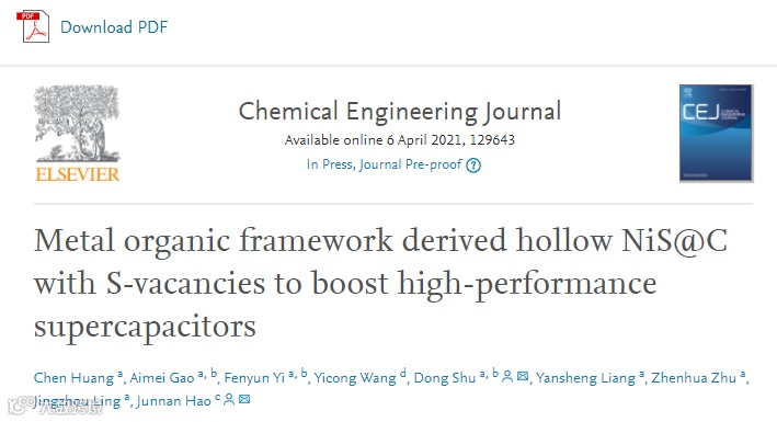 基于此,来自华南师范大学的舒东教授,在国际知名期刊Chemical Engineering Journal上发表题为“Metal organic framework derived hollow NiS @C with S-vacancies to boost high-performance supercapacitors”的观点文章。