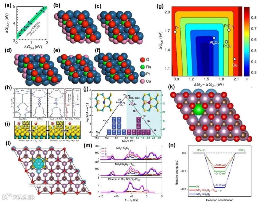 图3. DFT计算在揭示几种典型的非碳基单原子催化剂的电子结构和吉布斯反应自由能的应用案例
