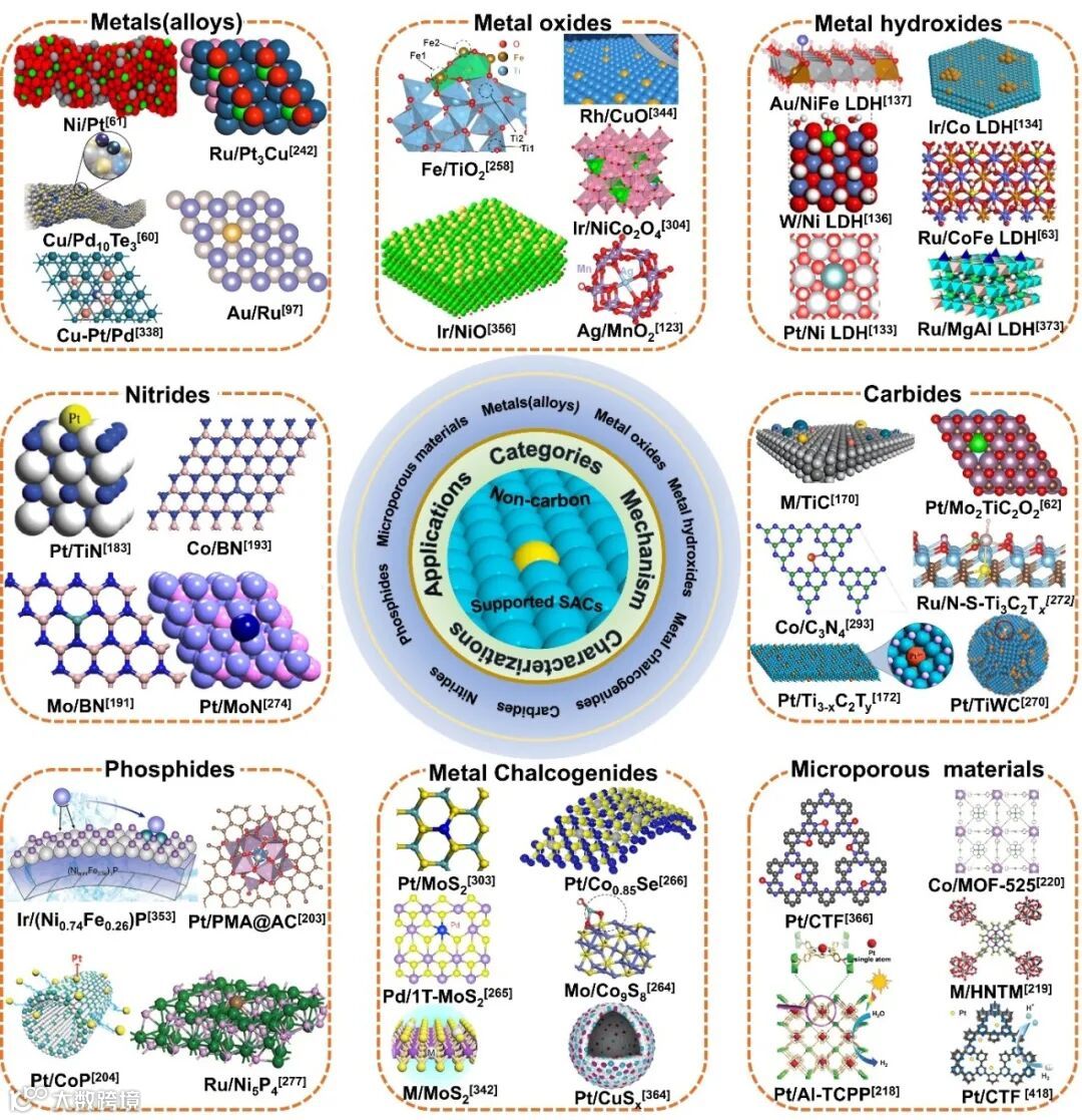 要点一:通过对非碳基单原子催化剂的总结,作者根据其基底性质把非碳基单原子催化剂分为八种类型,分别是金属(合金)、金属氧化物、金属氢氧化物、金属硫属化物、碳化物、氮化物、磷化物和微孔材料负载的单原子催化剂。