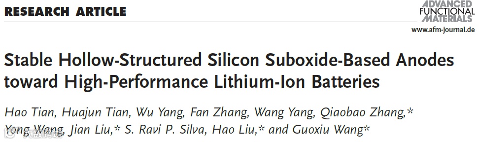 刘健、Hao Liu、Guoxiu Wang教授 AFM: 中空低氧化硅基负极助力高性能锂离子电池