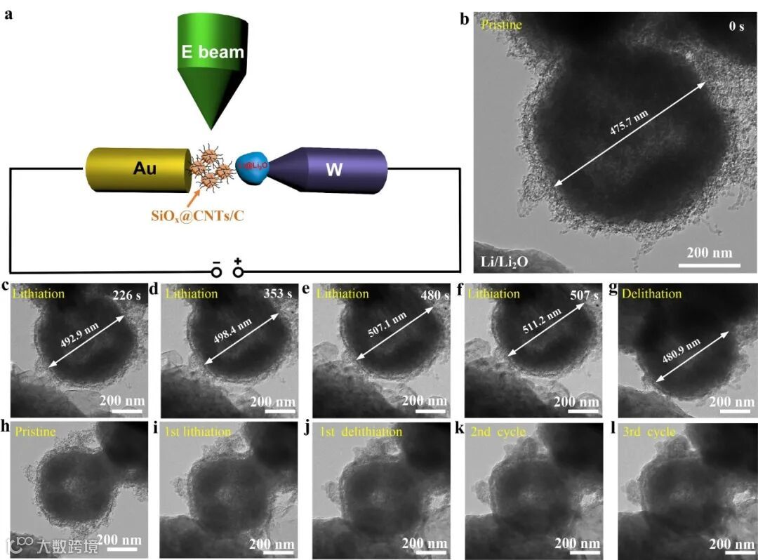 研究人员利用原位透射电子显微镜(TEM)表征验证,SiOx@CNTs/C复合纳米材料的内部空隙可以有效地缓冲锂的嵌入/脱出过程中的体积膨胀/收缩。