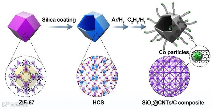 图1. 以ZIF-67为模板合成SiOx@CNTs/C复合材料的示意图。