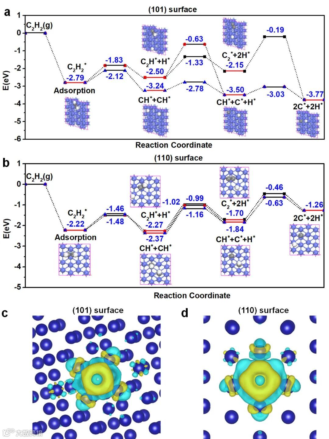 研究人员对乙炔在Co的(101)和(110)表面上的分解反应机理,进行了密度泛函理论(DFT)计算。计算结果表明乙炔分子更容易吸附在Co的(101)晶面上,且C原子可以容易地沉积在Co的(101)晶面上。