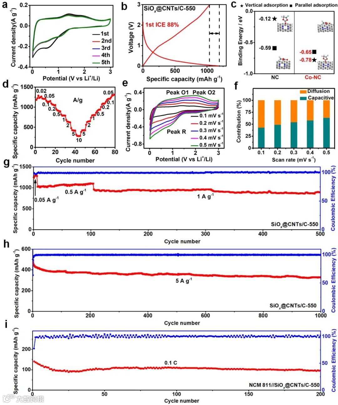 并且,全LiNi0.8Co0.1Mn0.1O2//SiOx@CNTs/C LIB电池具有高达325 Wh kg−1的能量密度以及优异的循环稳定性。该项工作对进一步深入理解低SiOx材料在锂离子电池负极上的应用研究具有重要意义。