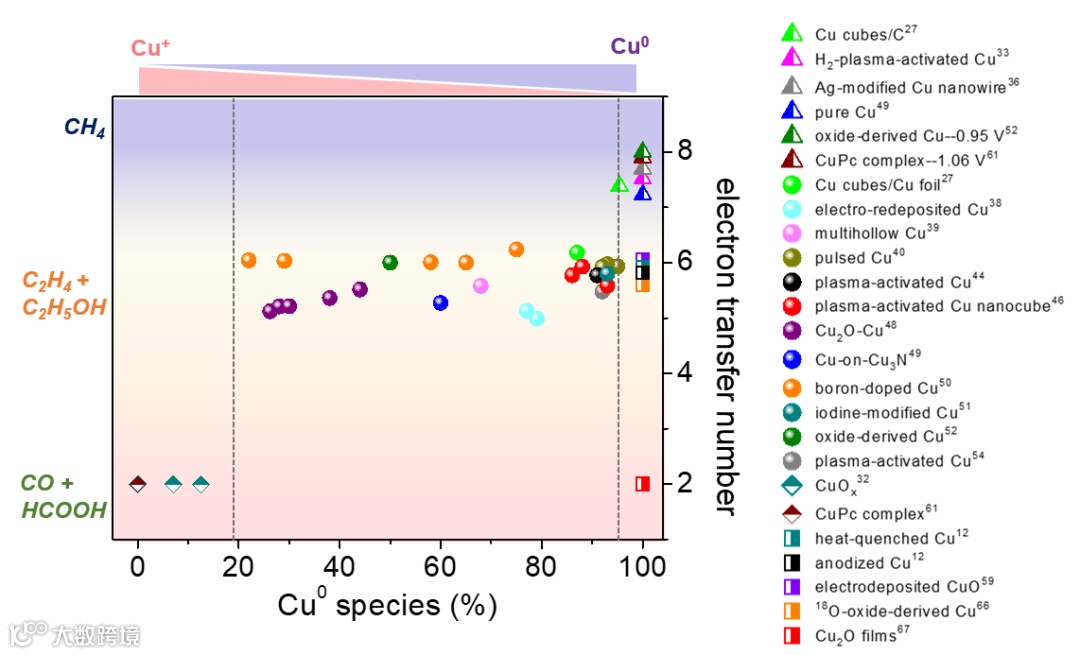 通过对大量文献进行重新梳理发现,铜基催化剂表面三种动态化学价态与CO2RR产物选择性紧密相关。当催化剂表面是Cu+和Cu0混合价态时,其电催化CO2RR过程中对C-C偶联生成乙烯/乙醇表现为较高的选择性,而表面主要存在Cu+或Cu0时,则分别选择性生成一氧化碳/甲酸和甲烷。