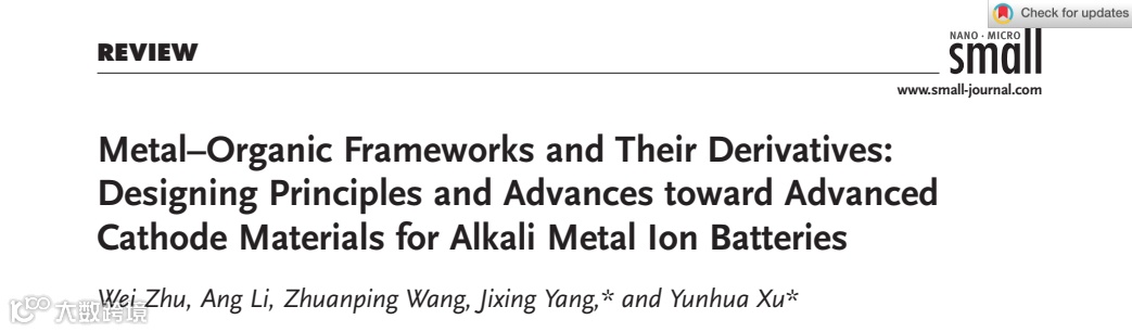 近日,来自天津大学的许运华教授、杨继兴副教授,在国际知名期刊Small上发表题为“Metal-Organic Frameworks and Their Derivatives: Designing Principles and Advances Toward Advanced Cathode Materials for Alkali Metal Ion Batteries”的综述文章。