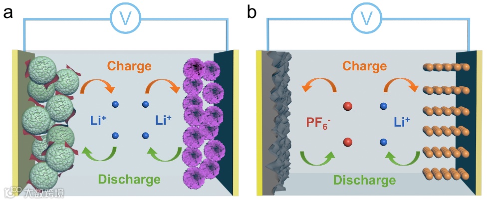 图1. 摇椅式器件(a)和电解液消耗型器件(b)的工作机理示意图。