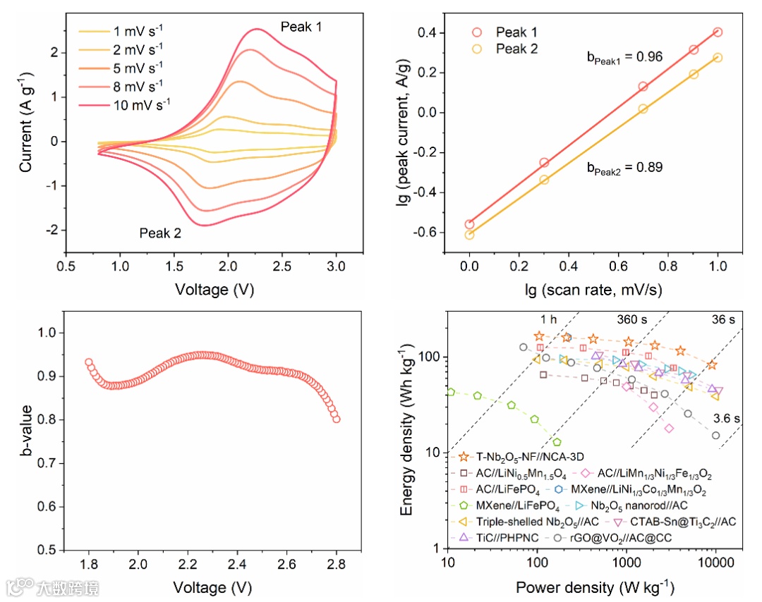基于响应电流和伏安测试扫速之间幂函数关系得到的指数b值被广泛用来研究电极反应动力学。从全器件的循环伏安曲线计算b值,发现其峰位置的b值分别高达0.96和0.89,同时在1.8到2.8 V的区间内,b值皆大于0.8,表明全器件具有优良的反应动力学。