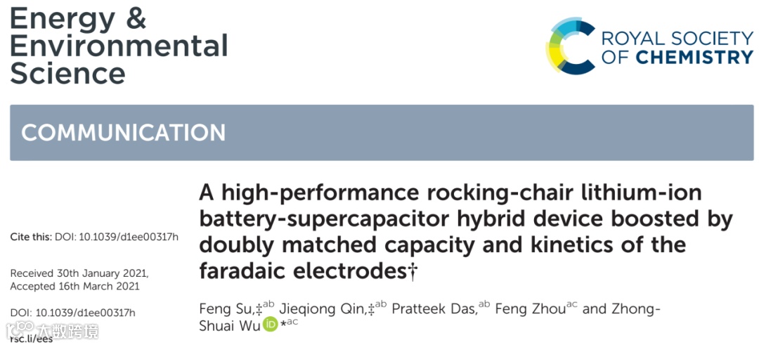 基于此,中国科学院大连化学物理研究所吴忠帅研究员团队在国际知名期刊Energy & Environmental Science上发表题为“A high-performance rocking-chair lithium-ion battery-supercapacitor hybrid device boosted by doubly matched capacity and kinetics of the faradaic electrodes”的研究论文。