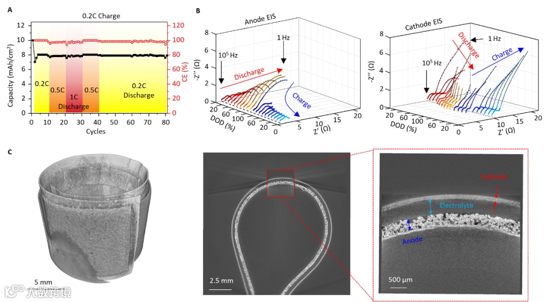 研究小组还使用了X-光微米断层扫描 (Micro-CT)来非侵入式地观察电池内部在反复扭曲变形后可能发生的电极剥离或微观损伤,从而确保电池在各类柔性应用中保持良好的机械韧性。此外,利用优化后的充放电系数,AgO-Zn电池可在0.2-1C的不同放电强度中循环充放电超过80次,在每个循环中均保持低阻抗,且在高放电速率下不会出现电容量损失。
