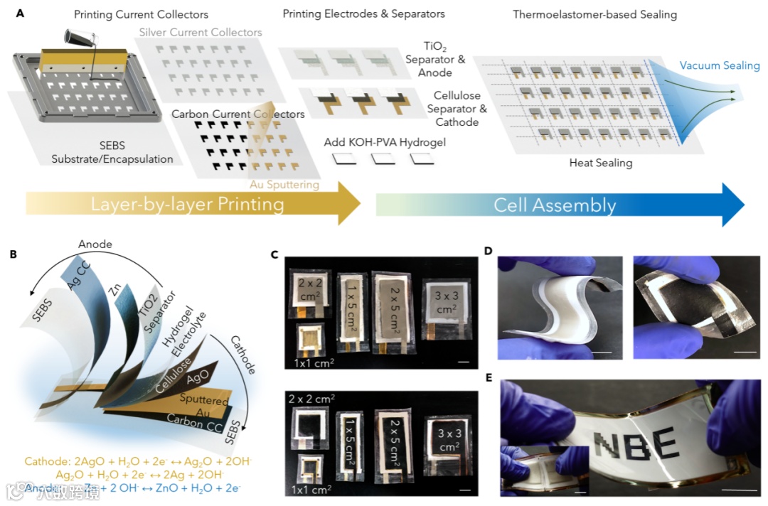 图1. (A)AgO-Zn柔性电池的批量逐层印刷及组装步骤。(B)电池层叠结构。(C)通过印刷可调整的不同电池尺寸 (D-E)展示电池及其系统的可弯曲性。
