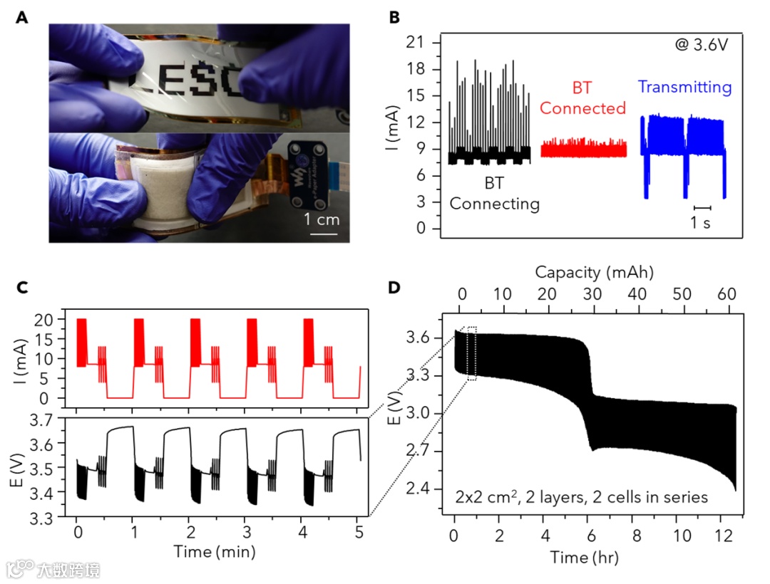 为了验证新型电池可为常见的小型电子系统供电,研究小组构建了具有微控制器单元(MCU)和蓝牙无线通信模块的柔性显示系统。该柔性电池通过模拟电子系统的放电功率曲线进行放电,与具有相同额定容量的商用纽扣电池相比,表现出了更加卓越的性能与续航。