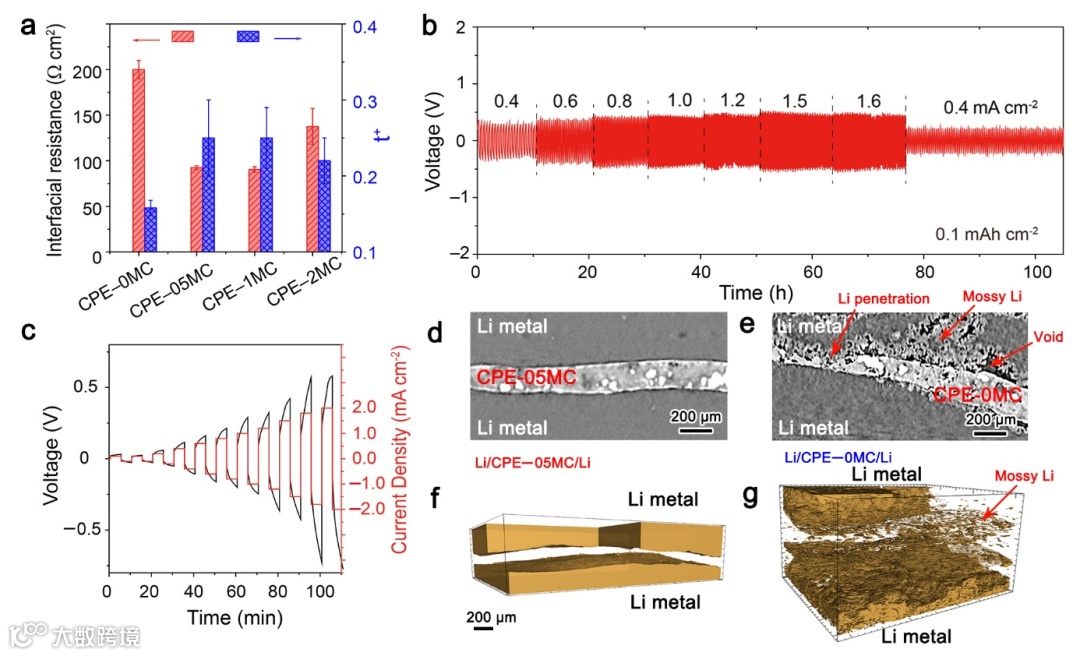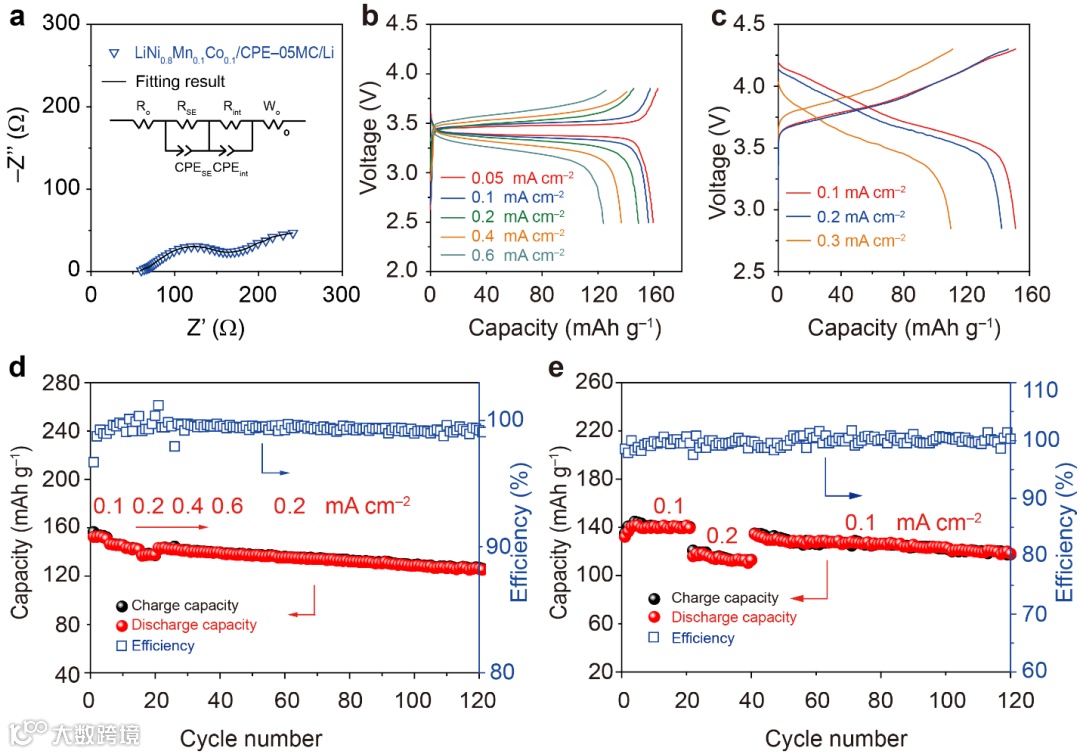 可将该聚合物电解质 金属锂电池的极限电流提高到 1.6 mA cm-2,在0.5 mAh cm-2容量下工作80小时以上。在全固态锂金属电池中,特别是活性NMC811表面包覆与改性后电解质之间的副反应得到有效缓解。