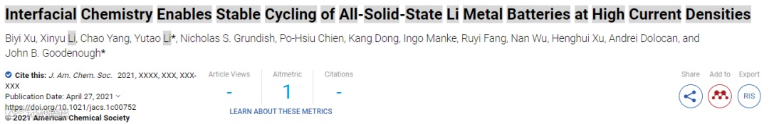 近日,来自美国德克萨斯大学奥斯汀分校 的李玉涛博士和John B. Goodenough教授在国际知名期刊J. Am. Chem. Soc. 上发表题为“Interfacial Chemistry Enables Stable Cycling of All-Solid-State Li Metal Batteries at High Current Densities”的研究文章。
