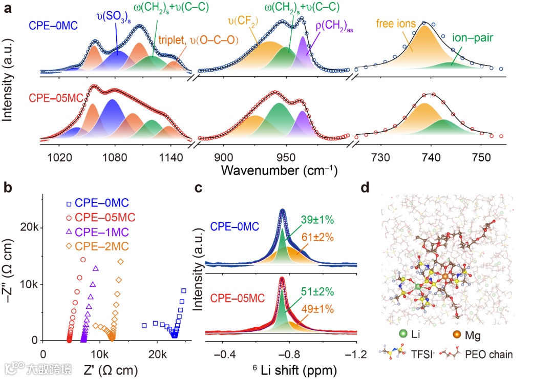 通过固态魔角旋转(MAS)核磁共振(NMR)和分子动力学(MD)模拟计算发现,Mg2+离子更容易与PEO和TFSI-中的氧原子配位且在PEO基体中几乎不迁移,此特性能同时提高PEO链段的电子结构和聚合物中可快速迁移的锂离子浓度,提高聚合物电解质的室温锂离子电导率。