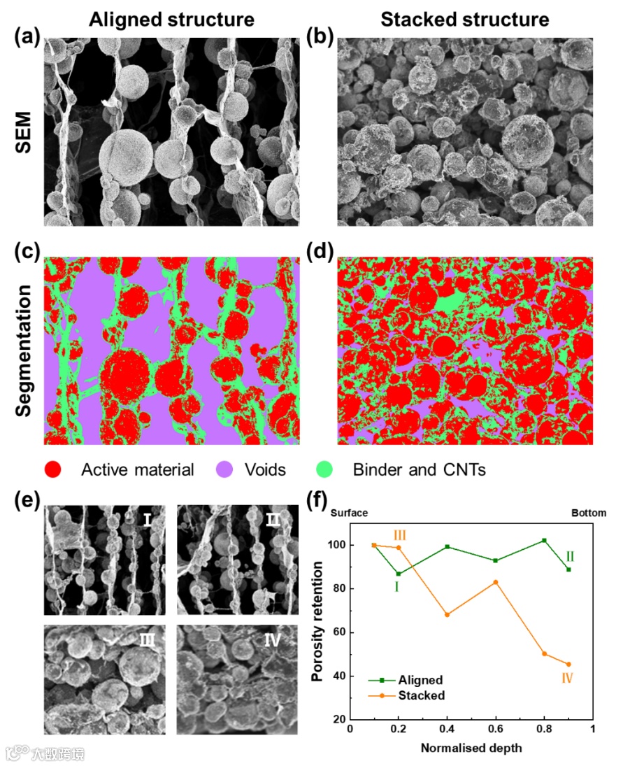 随着电极厚度、活性物质载量的增加,电极中缓慢的离子、电子传输制约了厚电极的性能的发挥。导向结构的电极可以减少电极结构中的曲折度从而提升厚电极中的离子传导,如何使用低活性成分来构造兼顾机械性能稳定、离子/电子高效传递的高载量电极成为了一大挑战。