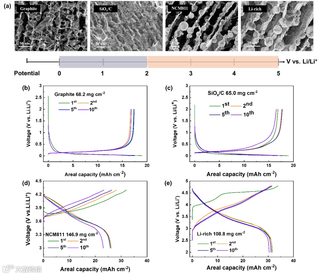 在不同正负极材料的电极中均能制造导向结构;同时,在宽泛的电化学窗口下,所制备的具有高载量的导向结构电极均能进行稳定的电化学循环(图4)。