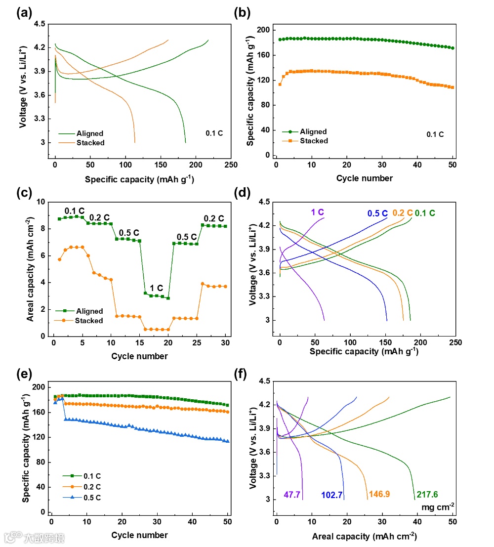 相比于传统的涂布、溶剂挥发方法制造的堆叠式电极结构,本文中所形成的导向结构电极具有分布均匀的孔隙率(图2)、并极大地降低了曲折度,有利于电解液的渗透以及电解液和电极材料表面的离子交换。当面载量为50 mg cm-2时,导向结构电极可以以0.5 C的较高的倍率进行稳定循环(图3)。