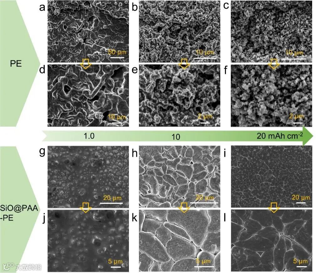 而采用SiO@PAA-PE 隔膜后,铜箔表面没有锂枝晶生长,呈现出饼状锂沉积,并且随着锂沉积量增加横向生长,最终形成紧密且平整的鱼鳞片状锂沉积形貌。