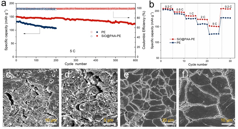 Figure 5. a) Cycling performance at 5 C and b) rate capabilities at various C-rates of the NMC811||Li cell cells with PE and SiO@PAA-PE separator in carbonate-based electrolyte. Top-view SEM images of Li metal anode from NMC811||Li cells with c-d) pristine PE and e-f) SiO@PAA-PE separators after 200 cycles.