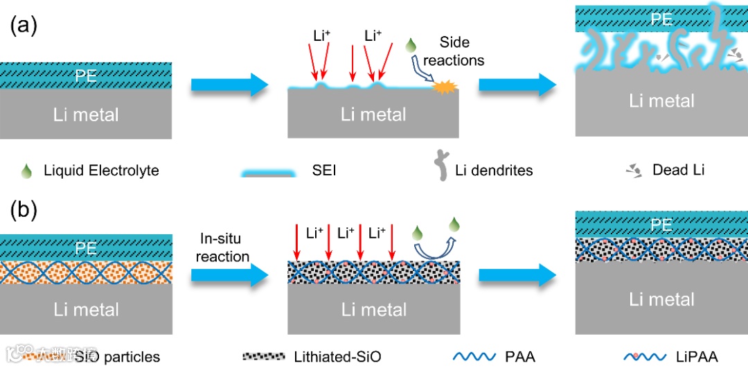 SiO@PAA-PE隔膜与锂金属负极接触后,在电池装配压力诱导下,界面处的SiO和PAA与金属锂发生原位反应,形成亲锂的刚柔并济保护层。