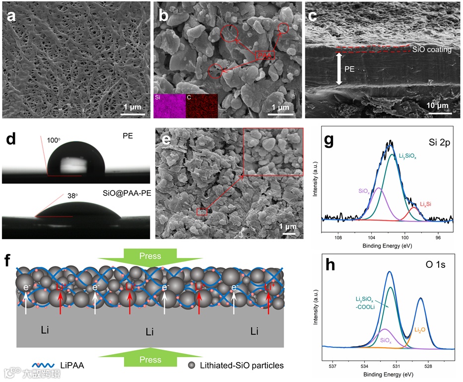 Figure 2. Top-view SEM images of a) PE and b) SiO@PAA-PE separators. c) Cross-sectional SEM images of SiO@PAA-PE separator. d) Static water contact angle images of PE and SiO@PAA-PE separator. e) Top-view SEM images of SiO@PAA-PE separator from disassembled SS|PE-SiO|Li cell after standing for 24 h. f) Schematic diagram showing the internal electron and Li+ transfer pathways in the direct contact lithiation process between SiO@PAA coating and Li foil under encapsulation pressure. XPS spectra of g) Si 2p and h) O 1s measured on the surface of Li metal anode in the SS|PE-SiO|Li cell after standing for 24 h.