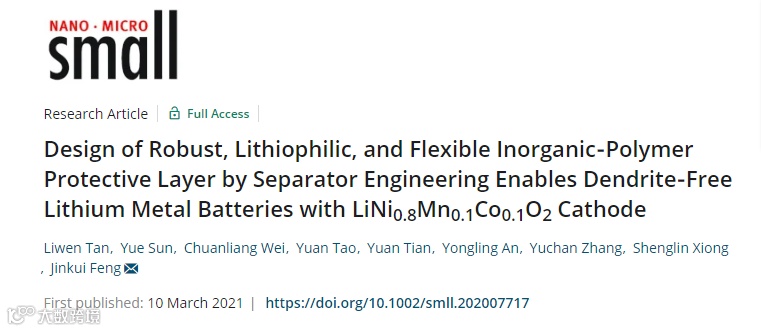 近日,来自山东大学的冯金奎教授课题组,在国际知名期刊Small上发表题为“Design of Robust, lithiophilic and flexible inorganic-polymer protective layer by separator engineering enables dendrite-free lithium metal batteries with LiNi0.8Mn0.1Co0.1O2 cathode”的文章。