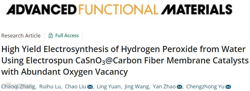 基于此,华东师范大学的刘超研究员、余承忠教授与武汉理工大学的赵焱教授合作,在国际知名期刊Advanced Functional Materials上发表题为"High Yield Electrosynthesis of Hydrogen Peroxide from Water Using Electrospun CaSnO3@Carbon Fiber Membrane Catalysts with Abundant Oxygen Vacancy"的文章。