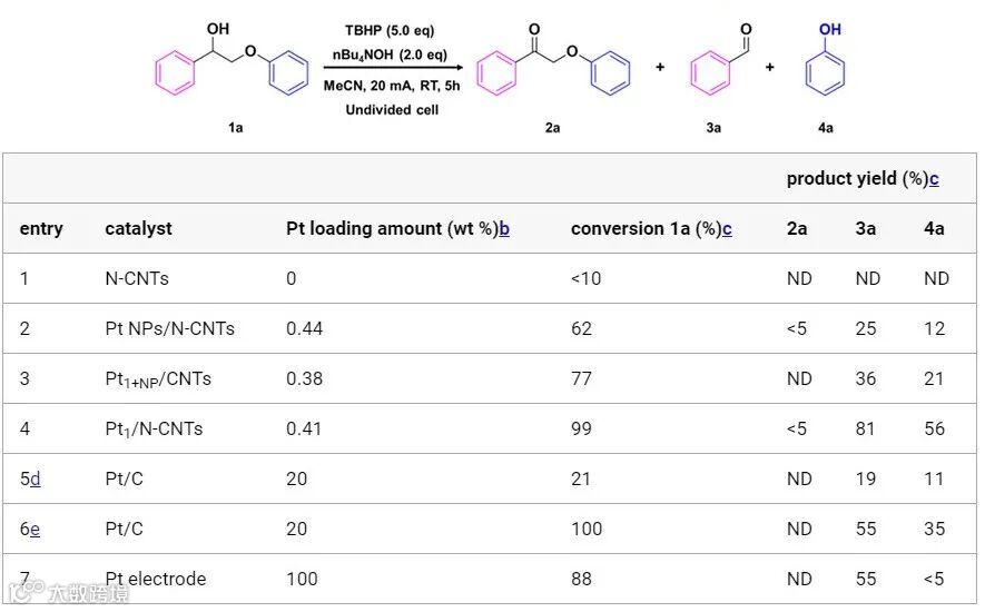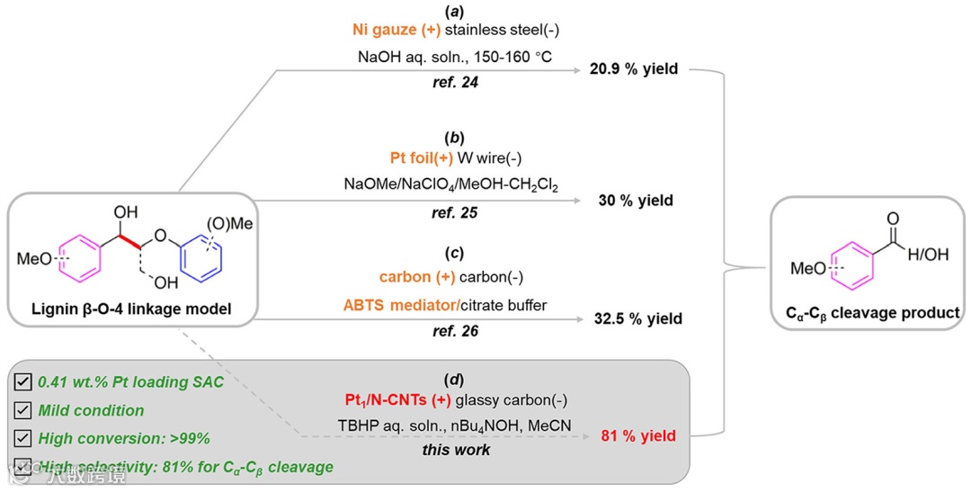 图1. 木质素 β-O-4 模型化合物中 Cα-Cβ 键的电催化氧化裂解。 (a)-(c) 先前报道的电催化系统,包括块状 Ni、Pt 和碳电极与 ABTS 介体结合。(d) 本工作中展示了在常温常压条件下使用 Pt1/N-CNTs 电催化剂进行高效和选择性的 Cα-Cβ 键氧化裂解。