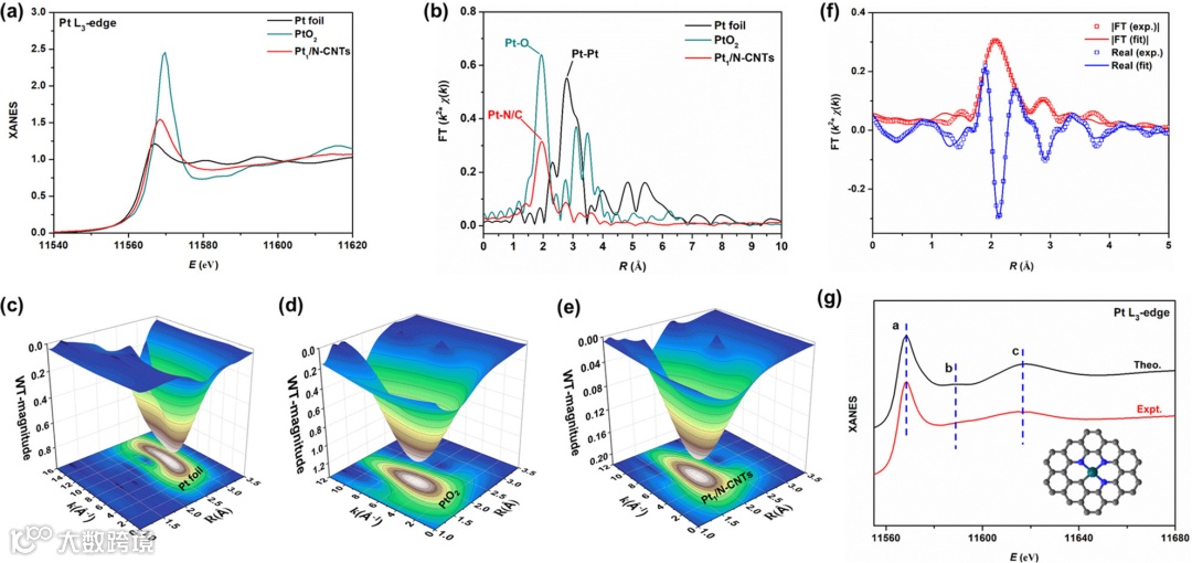 图3. Pt1/N-CNTs 催化剂中 Pt 单原子的结构鉴定。(a) Pt1/N-CNTs(红色)的 Pt L3-edge XANES 光谱,以及用于比较的 Pt 箔(黑色)和 PtO2(青色)。 (b) Pt1/N-CNTs(红色)的EXAFS 光谱。(c) Pt 箔、(d) PtO2 和 (e) Pt1/N-CNT 的小波变换图。 (f)拟合 的Pt1/N-CNT 的 R 空间。(g) Pt1/N-CNTs 的所测的 Pt L3-edge XANES 光谱与 Pt-N3C1 计算的理论光谱之间的比较。
