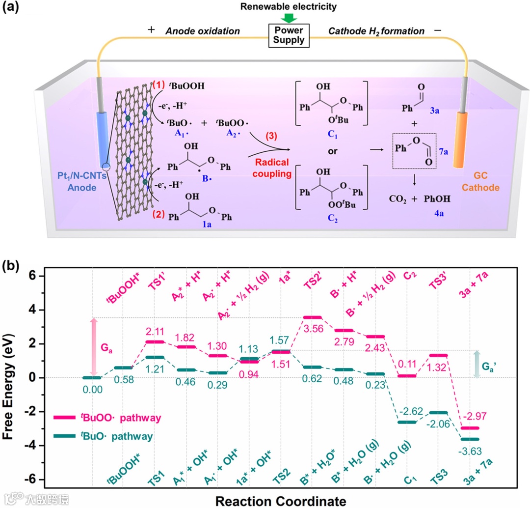 图4. 基于实验和 DFT 计算的反应途径。(a) 所提出的在Pt1/N-CNTs 上的催化转化机理。 (b) Pt1/N-CNTs 表面上 催化转换的 DFT 计算势能。