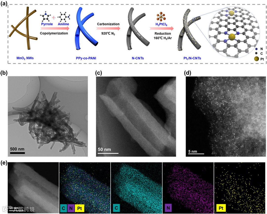 图2. Pt1/N-CNTs催化剂的合成和表征。(a) Pt1/N-CNTs 制备示意图。(b) Pt1/N-CNTs 的 TEM 图像。(c) Pt1/N-CNTs 的 HAADF-STEM 图像。(d) Pt1/N-CNTs 的球差电镜图像。 (e) Pt1/N-CNTs 的 EDX 元素mapping图。