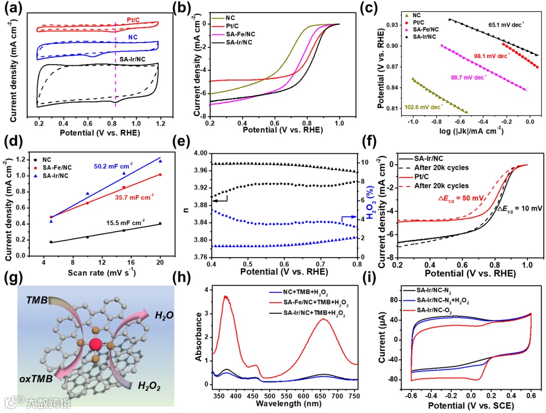 图3(a)SA-Ir/NC,NC和商业Pt/C在N2饱和(虚线)及O2饱和(实线)0.1 M PBS溶液中的CV曲线。(b)SA-Ir/NC,NC和商业Pt/C在O2饱和0.1 M PBS电解液中 1600 rpm 的旋转速度下的ORR极化曲线。(c)Tafel斜率图。(d)相关催化剂的电流密度与扫描速率的线性关系图。(e)SA-Ir/NC(球形)和商业 Pt/C(三角形)的过氧化氢产率和电子转移数。(f)SA-Ir/NC(黑色)和Pt/C(红色)循环测试后的ORR极化曲线。(g)H2O2和TMB催化反应的示意图。(h)不同的反应底物在0.1 M PBS电解液反应体系的紫外-可见光谱图。(i)SA-Ir/NC在N2饱和电解液中引入500 μM H2O2 以及 O2饱和的CV曲线。